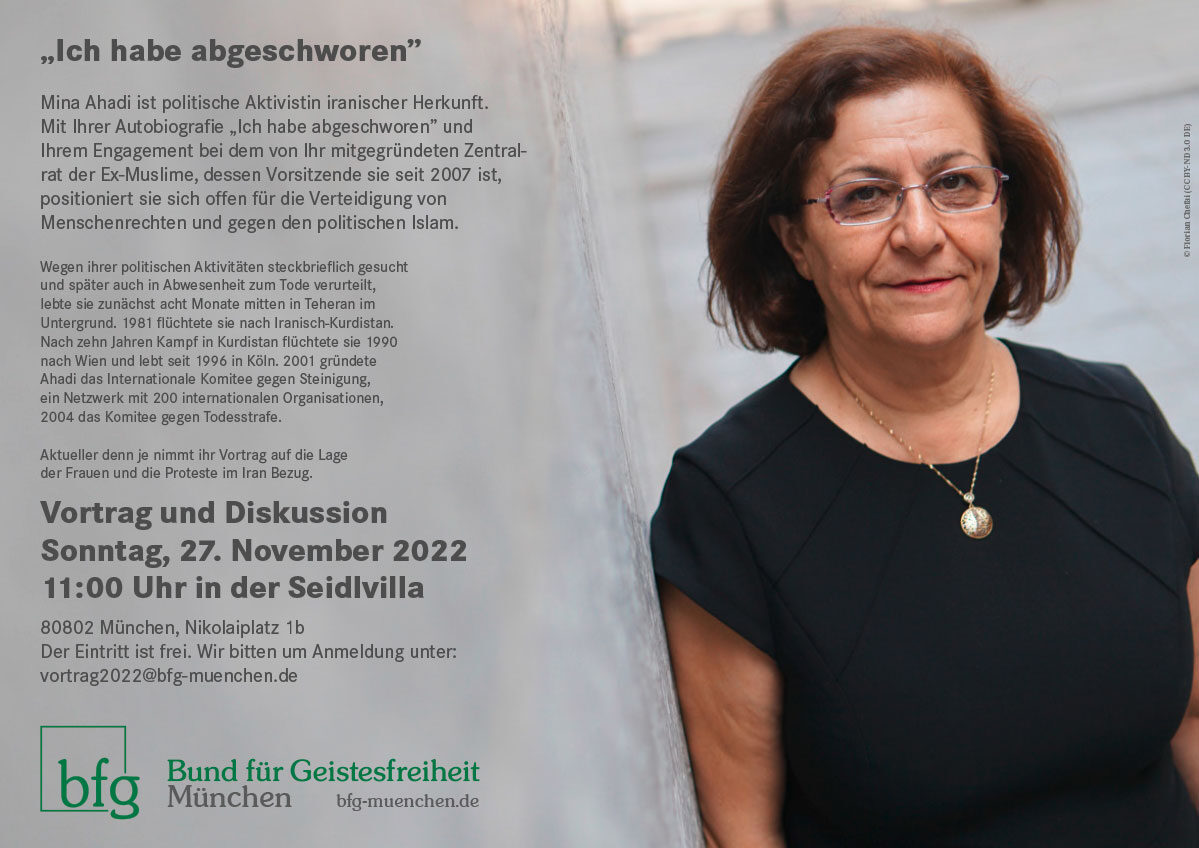 Der Bund für Geistesfreiheit München lädt am 27. November 2022 ein zu Vortrag und Diskussion mit Mina Ahadi vom Zentralrat der Ex-Muslime.